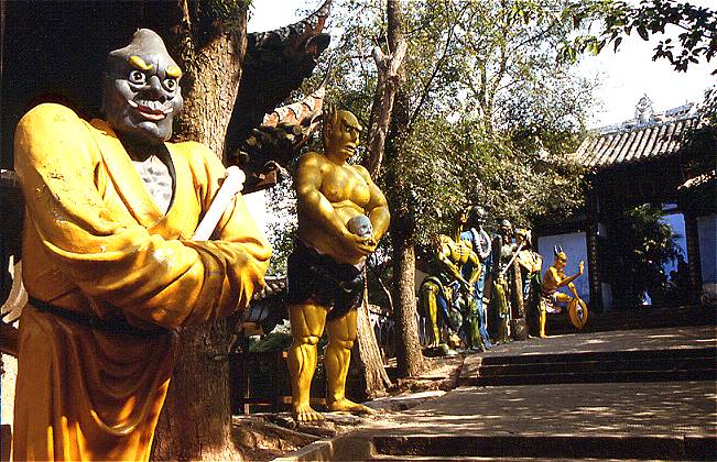 Bekommen für die Dauer der Kreuzfahrt einen Platz mit sieben deutschen Pensionisten an einem großen runden Tisch zugewiesen, mit denen wir uns im Laufe der Fahrt ganz gut unterhalten. Der erste Landgang bringt uns nach "Feng Du", der Geisterstadt, in der für einfache Gemüter anschaulich Gut und Böse dargestellt sind. Zurück am Schiff gibt's ein reichhaltiges Mittagessen und am Nachmittag eine Vorführung in chinesischer Tuschemalerei. Draußen zieht die Landschaft mit steilen Felswänden an den Ufern vorbei und nach dem Abendessen erfahren wir das Ausflugsprogramm für morgen.