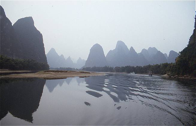 Pünktlich um 8 Uhr werden wir zur Flußfahrt abgeholt. Zuerst geht die Fahrt zum Touristenhafen, wo an die zwanzig flache Ausflugsschiffe mit je ca. 100 Passagieren beladen werden. Ruhig zieht die Karawane durchs seichte Wasser an Schilfgürteln, Bambushainen, Karstkegeln und weidenden Wasserbüffeln vorbei. Gegen halb elf gehen wir zum Besuch der "Crown-Cave" an Land. Dieser Abstecher dauert fast drei Stunden und führt uns zu Fuß, per Eisenbahn und per Ruderboot durch eine atemberaubende Höhlenlandschaft. Nach einem späten Mittagessen lassen wir am Sonnendeck die Landschaft an uns vorbeiziehen und steigen um fünf in einen Bus, der uns über rumpelnde Straßen zurück nach Guilin bringt.