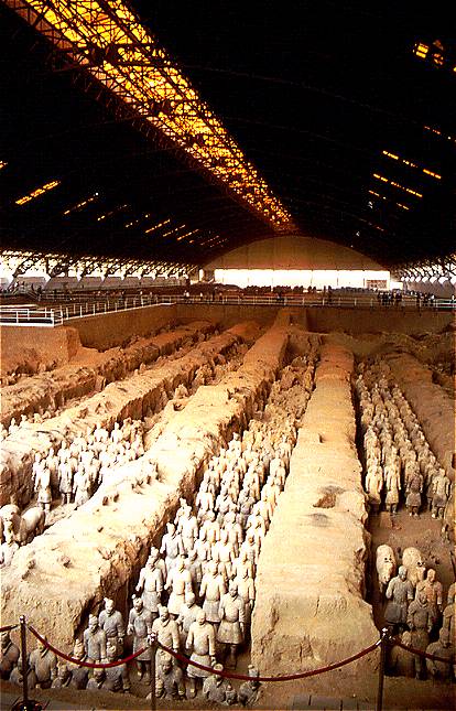 Frühmorgens zum Flughafen gebracht worden und 1½ Stunden nach Xi'an geflogen. Auch hier funktioniert der Abholservice gut und wir organisieren gleich einen Wagen mit Fahrer zu den Sehenswürdigkeiten außerhalb der Stadt. Den Beginn macht kurz vor 11 Uhr das steinzeitliche Dorf "Banpo", dann geht die Fahrt weiter zum 8. Weltwunder. Die Ausgrabungen am Grab des ersten Kaisers von China sind wirklich imposant, aber alles wird übertroffen von der überlebensgroßen Tonarmee. In Reih' und Glied stehen tausende Krieger, 2 Meter groß, jeder anders, jeder eine Persönlichkeit, in Schlachtformation mit Pferden und Wagen. Eine Rundum-Filmvorführung (über das Leben des ersten Kaisers, die Entstehung und Zerstörung der Tonarmee und das Wiederauffinden und Freilegen) vertieft den gewaltigen Eindruck noch. Nach über drei Stunden verlassen wir das Grabmal und machen uns auf zur letzten Station unseres heutigen Ausfluges, dem Thermalbad der Tang-Kaiser mit Park, Pagoden und Bassins. Sind nach Sonnenuntergang wieder im Hotel und verköstigen uns am nahegelegenen Essensmarkt.