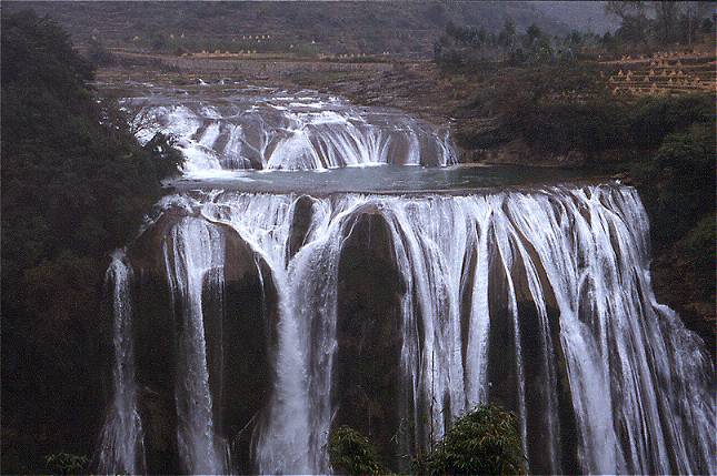 Zeitig aus den Federn und fast pünktlich vom Minibus abgeholt worden. Sammeln noch weitere chinesische Fahrgäste ein und fahren dann über rumpelnde Mautstraßen. Nach einem ersten Stop bei einem Miao-Dorf (das ist eine der ethnischen Minderheiten Chinas) mit tirolerabend-ähnlicher Folklorevorführung zu einer Schlangenfarm mit Verkaufsvorführung von Heilsalben und anderer Wundermittel gebracht worden. Für uns als einzige Nicht-Chinesen etwas mühsam. Aber nach 150 km doch endlich an unser eigentliches Ziel gekommen: die höchsten Wasserfälle Chinas. Zuerst gibt's ein Mittagessen mit Blick auf die Wassermassen, danach besuchen wir zuerst noch den "Steinwald", eine bizarre Karstlandschaft mit malerischen Spazierwegen an einem See. Beim Wasserfall selbst trennen wir uns von der restlichen Gruppe und überqueren auf einer Hängebrücke den Fluß, bevor wir den steilen Weg hinauf und hinter dem Wasserfall entlanggehen. Freuen uns schon auf die Heimfahrt durch die malerische Landschaft mit Reisfeldern, pflügenden Wasserbüffeln und Getreide dreschenden Landarbeitern, aber leider werden keine Fotostopps eingelegt, sondern noch zwei Souvenirläden angesteuert. Kommen gegen halb neun bei leichtem Regen durchgebeutelt wieder in unserem Quartier an.