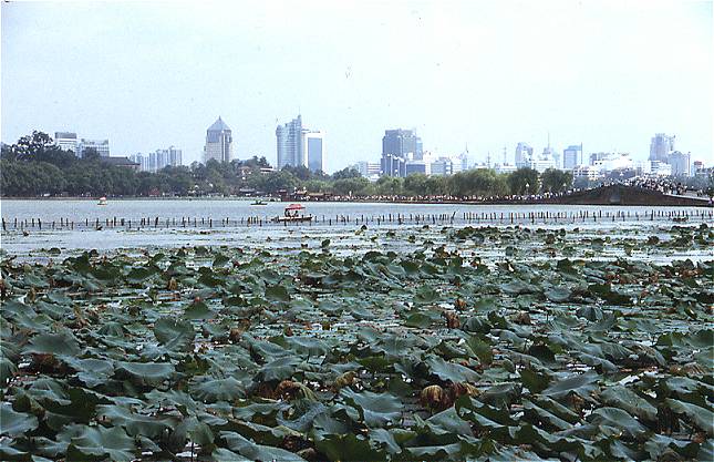 Haben heute das erste Mal ein Problem, ein Taxi zu bekommen. Es sind hunderte auf der Straße, aber so gut wie alle sind schon besetzt, und die anderen treibt unser Fahrtziel, der "Tempel des Seelenfriedens", in die Flucht. Erst mit Hilfe des Portiers ergattern wir ein sündteures Gefährt, mit dem wir aber 30 Minuten für 500 m brauchen. Entnervt geben wir auf und lassen uns am Ufer des Westsees absetzen. Mit unendlich vielen Chinesen spazieren wir die Seepromenade entlang, überqueren die künstlich angelegte Wasserfläche auf einem der Dämme, besuchen ein Stempelmuseum und organisieren endlich am Südende des Sees eine Motorrad-Rikscha, die uns zur "Quelle des laufenden Tigers" bringt. Auch in dieser Parkanlage wimmelt es von Menschen, aber keine westlichen Touristen hellen das Bild auf. Ergattern nun ein Taxi zur hölzernen "Pagode der sechs Harmonien", die über dem Fluß liegt und einen netten Blick in die Landschaft gewährt. Fahren weiter westwärts zum Zoo und haben dann für die Heimfahrt dasselbe Problem wie am Vormittag - alle Taxis sind belegt. Geben uns das Erlebnis einer Busfahrt in China, eine Sardinenbüchse ist Platzverschwendung dagegen! Jetzt kapieren wir endlich den Grund für die Menschenmassen: zum 50-Jahr-Jubiläum der Staatsgründung haben die Chinesen eine ganze Woche frei bekommen, halb China ist auf Urlaub. Haben heute nicht mehr viel vor, besorgen nur noch etwas Proviant gleich um die Ecke am Markt.