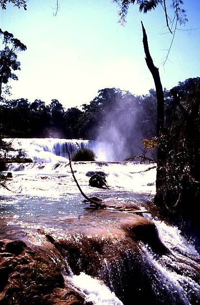 Zum Ausklang unseres Aufenthalts in Chiapas unternehmen wir noch einen (organisierten) Ausflug zu diversen Naturschönheiten. Mit einem Minibus geht's zuerst zum Wasserfall von Misol Há, der sich 30 m in die Tiefe stürzt, dann weiter nach Agua Clara, einem türkisblauen See mit einer atemberaubenden Hängebrücke darüber. Das eigentliche Ziel des Ausflugs ist allerdings Agua Azul, wo sich ein Fluß weißschäumend über zahlreiche Felstreppen in verschiedene Becken ergießt, in denen man auch baden kann. Nach einer kurzen Erfrischung in den Fluten steigen wir dem Ufer entlang in die Höhe und uns bietet sich ein wunderschöner Blick über die sattgrüne Tropenlandschaft. Nach der Rückkehr ins Hotel lassen wir den ohnehin geruhsamen Tag erst am Pool und dann in einem Terrassen-Restaurant ausklingen.
