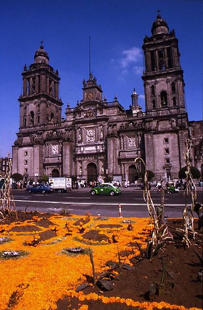 Nach dem Frühstück (der Einfachheit halber im Hotel-Restaurant) bei strahlendblauem Himmel zur Metro-Station Insurgentes spaziert und mit der U-Bahn zum Zócalo gefahren. Dieser riesige Hauptplatz wird flankiert von der Kathedrale im Norden, dem Nationalpalast auf der Ostseite und diversen kolonialen Prachtbauten. Schlendern erst einmal durch die "Allerheiligen-Dekoration" (mit vielen orangen Blüten geschmückte, nachgebildete Gräber und Friedhöfe), bevor wir uns das Innere der Kathedrale ansehen. Reich verzierte Seitenkapellen und goldglänzende Altäre erwarten den Besucher. Unser nächstes Ziel ist der Nationalpalast, den man nur gegen Vorlage des Reisepasses betreten darf. Drinnen bewundern wir die Murales (Wandmalereien) im Treppenaufgang, die in ausdrucksstarken Bildern die wechselvolle Geschichte Mexikos darstellen. Kurz vor zwölf begeben wir uns hinter die Kathedrale und besuchen dort die Ausgrabungen des Templo Mayor und das angeschlossene, nett gestaltete Museum am Platz des einstigen Zentrums der mexikanischen Welt. Unser Weg führt uns dann weiter zum Torre Latinoamericano, dessen Aussichtsplattform wir mit dem Lift erreichen. Von dort oben haben wir einen überwältigenden Blick über die Stadt, die durch einen leichten Dunstschleier am Horizont schier endlos erscheint. Wieder zu ebener Erde werfen wir noch einen Blick in die Hallen des Palacio de Bellas Artes und die Ausstellungsräume der Casa de Iturbide und legen dann im Alameda-Park eine kurze Rast ein. Schlendern zurück zum Zócalo und besteigen die Metro heimwärts in die Zona Rosa. Dort nehmen wir dann auch in einem einfachen Lokal ein mexikanisches Abendessen zu uns. Sind rechtschaffen müde und hauen uns bald auf's Ohr.