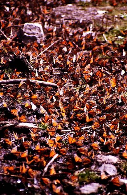 Werden pünktlich von einem Reisebüro-Mitarbeiter beim Hotel abgeholt und bald sind wir unterwegs zum Winterquartier der Monarch-Falter. Zuerst geht's über den Paseo de la Reforma hinaus aus der Stadt, auf der Autobahn über einen Paß (3.045m), dann durch die Industriestadt Toluca, über kurvige enge Bergsträßchen und durch kleine Dörfer mit bunten Häusern und blumengeschmückten Balkonen, bis wir gegen zwölf das "Besucherzentrum" im Reserva Especial de la Biósfera Mariposa Monarca in ca. 3.500 m Seehöhe erreichen. Werden einem örtlichen Führer übergeben, der munter durch den Wald den Berg hinaufwandert, mit uns keuchenden Touristen im Schlepptau. Nach 2 Wochen auf Meeresniveau macht uns die dünne Luft hier oben doch recht zu schaffen. Glücklicherweise müssen wir nur 20 Minuten wandern, dann sehen wir die rostroten Falter in dichten Trauben an Ästen hängen, die Luft ist erfüllt von einem Rascheln wie von Seidenpapier. Millionen Schmetterlinge schwirren im Sonnenlicht um uns herum und lassen sich auch auf uns nieder. Noch ein paar Schritte weiter lichtet sich der Wald und wir erreichten eine Art Almwiese - wie bei uns in den Alpen auf ca. 1500 m - die von einem winzigen Bächlein durchflossen wird. Am Rande dieses Rinnsals belagern Tausende von Monarchfaltern den sumpfigen Boden, jeder Schritt bringt Unmengen von Schmetterlingen zum Auffliegen. Wir sind restlos bezaubert von diesem Schauspiel und können uns fast nicht mehr losreißen. Aber gegen halb drei brechen wir doch auf. In Toluca gibt's das im Preis inbegriffenen Essen, dann fahren wir mit der untergehenden blutroten Sonne im Rücken zurück nach Mexico-City. Nach Einbruch der Dunkelheit überqueren wir den Paß und unter uns liegt die Metropole wie glühende Lava im Tal - ein überwältigender Anblick. Bald darauf sind auch wir ein Teil dieses Lichtermeeres und stauen fast eine Stunde auf der Reforma bis zu unserem Hotel.