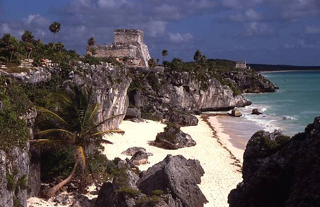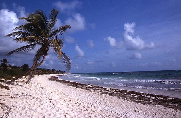 Stehen zeitig auf und machen uns auf die rumpelige Fahrt zu den Ruinen von Tulum, die wir um 8:00 Uhr erreichen. Diese alte Mayastadt liegt malerisch eingebettet zwischen blauem Himmel, türkisem Meer, üppiger Vegetation und schroffen Felsen. Die einzelnen Gebäude sind weiträumig abgesperrt, aber der Reiz der Anlage liegt sowieso in der Lage über dem Meer. Rechtzeitig vor dem Eintreffen der geballten Touristenflut aus Cancun verlassen wir die Ruinenstadt und frühstücken in einem der Lokale im Touristen-Ausnehm-Zentrum. Fahren dann in den Ort, buchen für morgen einen Jeep-Boot-Schnorchel-Ausflug ins Naturschutzgebiet Sian Ka'an und besorgen etwas Proviant. Rumpeln zurück zum Quartier und verbringen den Nachmittag wie gestern am Strand. Lassen uns wieder im hoteleigenen Restaurant verwöhnen und gehen bald schlafen.