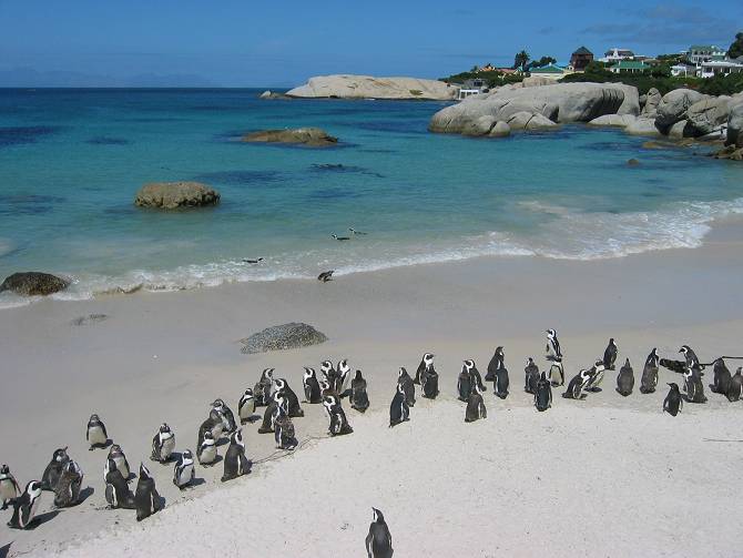 Nach einem gemütlichen Frühstück von Andrea und Nicola mit Tips versorgt worden. Auf dem Programm steht heute eine Rundfahrt um die Kap-Halbinsel. Erst geht's über die M63 zu den "Kirstenbosch Botanical Gardens", hier bewundern wir die vielfältige Welt der Proteen und anderere Fynbos-Gewächse, dann folgen wir der M41 zum ältesten Weingut Südafrikas, Groot Constantia. Das Herrenhaus und das Museum im alten Weinkeller sind ganz hübsch, aber der Verkostungsraum ist eine unpersönliche Touristen-Abfertigung. Machen uns bald auf den Weg zur M4 und dieser folgend nach Muizenberg. Am Strand von St. James machen wir die Pflichtfotos der reizenden bunten Badehütten und fahren der Küste entlang bis Simon's Town. Auch dort ist ein Pflichtbesuch angesagt und zwar bei den Pinguinen. Diese stehen putzig aufgefädelt an der Brandungslinie oder watscheln zwischen den Felsen umher.
