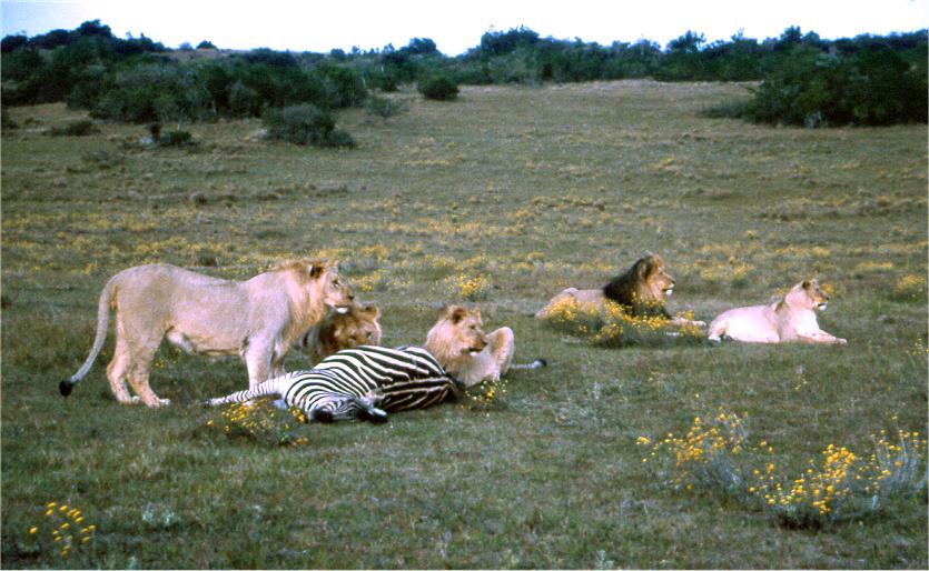 Jetzt frischt der Wind auf und wir sind froh über die Teepause. Dann, ausgestattet mit Pulli und Windjacken, geht es weiter zum Wasserloch mit den 2 Nilpferden, weiter zum Zaun, der Schotia-Farm und Addo-Nationalpark trennt, um eventuell einen Blick auf ein paar Elefanten zu werfen und endlich in den ca. 600 ha großen separierten Teil der Farm, in dem die Löwen gehalten werden. Heute früh ist ein Zebra verendet und dieses wird nun den Raubkatzen serviert. Im spärlichen Licht der untergehenden Sonne können wir beobachten, wie 2 erwachsene und 4 halbwüchsige Löwen ans Werk gehen - Mahlzeit!