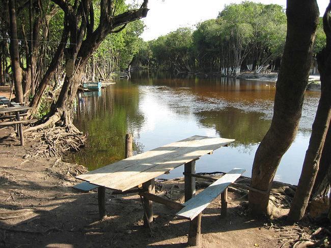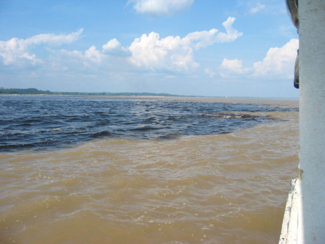 gebracht werden. Dabei handelt es sich um den Zusammenfluß von Rio Negro (einem 28° warmen Schwarzwasserfluß) und Rio Solimões (einem 21° kühlen Weißwasserfluß). Da die Wassertemperaturen und Fließgeschwindigkeiten der beiden Flüsse sehr unterschiedlich sind, brauchen die auch sehr verschieden gefärbten Wassermassen mehrere Kilometer, bis sie sich zum einheitlich aussehenden Amazonas vermischen. Bis es soweit ist, fließen die beiden Flüsse mit scharfer Trennlinie nebeneinander her. Auch ein paar Flußdelphine erweisen uns die Ehre ihrer Anwesenheit und machen den 30-Minuten-Ausflug noch zusätzlich sehenswert.