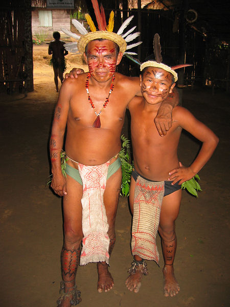 erreichen. Werden vom Häuptling freundlich begrüßt und dann zeigen uns die Dorfbewohner traditionelle Tänze und Riten einer Verlobungsfeier, in die wir schließlich auch noch eingebunden werden. Anschließend schauen wir uns noch diverses Kunsthandwerk an, das tatsächlich noch von den Indios produziert und nicht billig aus China importiert wird. Auf dem nahegelegenen Schwarzwassersee unternehmen wir dann noch eine Bootsfahrt und schwimmen auch noch ein paar Züge in diesem angenehm temperierten See, während am Ufer ein kleiner Indio von oben bis unten gebadet und daneben das Geschirr gewaschen wird. Müssen dann aber bald zum Boot zurückstapfen, denn so nahe am Äquator geht die Sonne sehr rasch unter und tatsächlich ist es bei unserer Ankunft im Hotel schon dunkel.