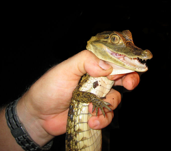 - die sind gerade beim Abendessen und haben nicht unser Problem mit den in der Dämmerung nun massenhaft auftauchenden Moskitos. Reiben uns dick mit Schutzmittel ein und tauschen die Angelrute gegen einen kräftigen Handscheinwerfer. Damit sucht Michael das Ufer nach Brillenkaimanen