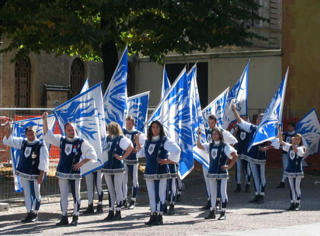 An den Marktständen in der Altstadt werden neben Trüffel und Öl auch Käse, Nüsse und Salami angeboten, die Umgebung gehört den klassischen Marktfahrern mit Uhren, Leder, Hausrat und Co. Wir verkosten Nußtorte und Wurst, Honig und Trüffelöl und beim Schlendern zwischen den Ständen kommen wir zur Kathedrale. Die ist zwar zu, aber das stört uns nicht sonderlich, denn davor findet gerade eine Fahnenschwinger-Vorführung in historischen Gewändern statt. Die einzelnen Stadtviertel sind in den jeweiligen Farben beflaggt und wetteifern bei verschiedenen Gelegenheiten um die Gunst des Publikums.