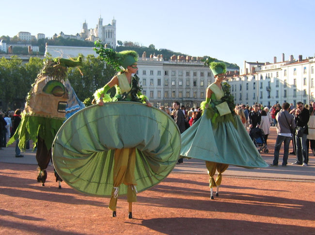 Auch der Brunnen mit den Pferden präsentiert sich malerisch. Uns ziehen aber im Moment die Straßencafès an. Ergattern einen Sitzplatz und schauen Leute. Dabei fallen uns die vielen bunt kostümierten meist jungen Leute auf, die singend und tanzend den Platz und die Seitengassen bevölkern. Beim Weiterspazieren kommen wir zum Place Bellecour und dort spielt es sich ab! Wir sind in das alle zwei Jahre stattfindende Tanzfestival Maison de la Danse geraten. Schauen bis halb sieben dem bunten Treiben zu, dann machen wir uns auf die Suche nach einem der empfohlenen Lokale, die hier in der Nähe sein sollten. Begutachten die ausgehängten Speisekarten und haben bald einen Favoriten