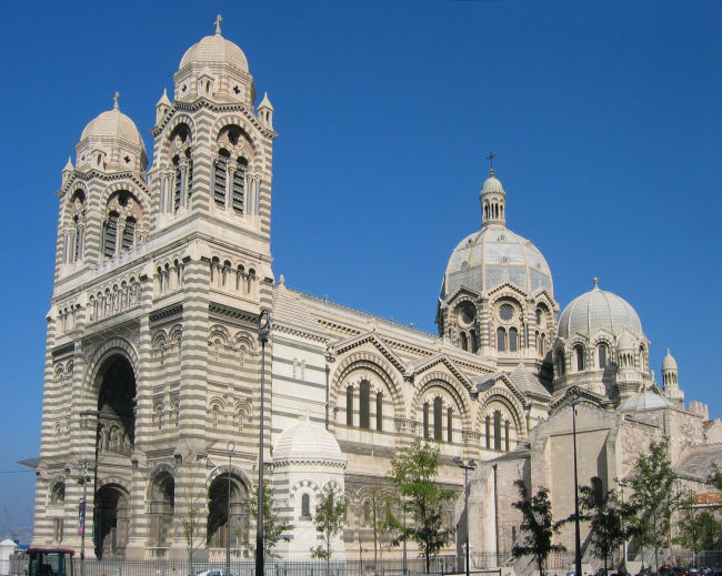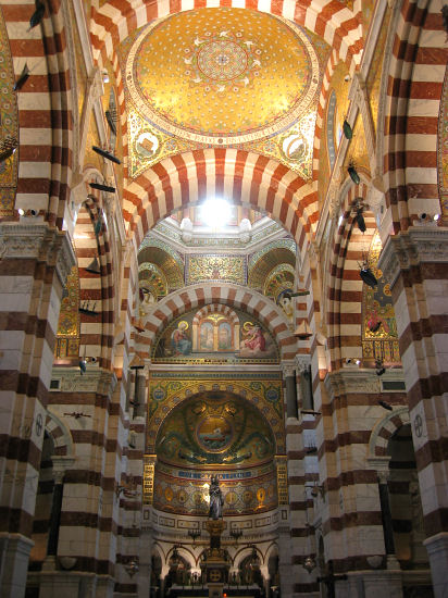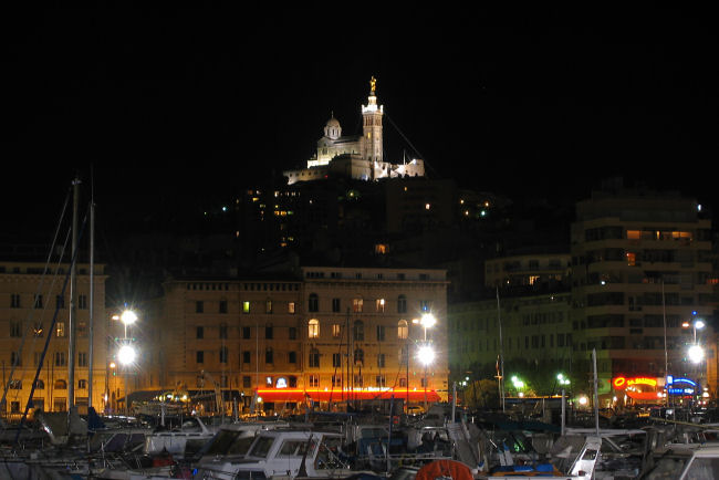 Nehmen dann den Bus 60 zur Wallfahrtskirche Notre Dame de la Garde, die neobyzantinisch auf einem Hügel über dem Hafen thront und die Seefahrer beschützt. Sie ist über und über mit Gold und Mosaiken geschmückt und der Blick über die Stadt und das Meer zu den vorgelagerten Inseln ist sehr hübsch. Nach einer Stunde Besichtigung fahren wir zu Mittag wieder hinunter ins Zentrum. Dort staut es rundherum, Polizisten mühen sich vergeblich mit dem Verkehr ab und wir verlassen unplanmäßig an einer Kreuzung den Bus. Spazieren dann durch die steilen Gassen des Altstadt-Viertels zum Centre de la Vieille Charité. Es gäbe eine Van Gogh-Ausstellung, aber wie wir feststellen, erst ab morgen. Halten stattdessen Mittagsrast im arkadengeschmückten Innenhof und gehen dann zur Kathedrale. Die ist aber montags zu und zudem noch von einer riesigen Baustelle umgeben, denn die ganze Uferpromenade am neuen Hafen wird umgestaltet. Ergattern mit etwas Mühe noch den 83er-Bus, der fährt planmäßig die ganze Küstenstraße aus und wir wollen so gemütlich diese Seite der Stadt kennenlernen. Aber beim Hafen ist Schluß: die innerstädtischen Buslinien sind wegen des EU-Indien-Gipfels und der Anwesenheit von Präsident Sarkozy und dem Vorsitzenden der EU-Kommission Barroso kurzerhand aus Sicherheitsgründen gesperrt.
