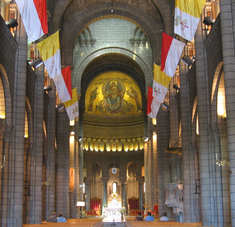 Wollen gleich auf Entdeckungstour gehen und fragen die Rezeptionistin um einen Stadtplan und ein paar Tips. Bekommen in bestem Englisch Besichtigungsvorschläge und Lokalempfehlungen - im Tourismusbüro hätte es nicht besser sein können. So aufs beste vorbereitet spazieren wir bei lebhaftem Wind, aber mehr Sonne als zuletzt, zur Metrostation und fahren ins historische Zentrum. Bei der Station Vieux Lyon steigen wir auf die Standseilbahn um und lassen uns auf den Fourvière-Hügel fahren. Gleich gegenüber der Bergstation strahlt die neobyzantinische Kirche Notre Dame de Fourvière im Sonnenlicht. Innen ist sie um einiges dunkler, aber Stuck und Mosaike, Gold und Weiß prägen die Ausstattung. Vor der Kirche kann man die große goldene Marienstatue von Nahem bewundern, die nach den abgeschlossenen Renovierungsarbeiten wieder die Kuppel des Turmes schmücken wird.