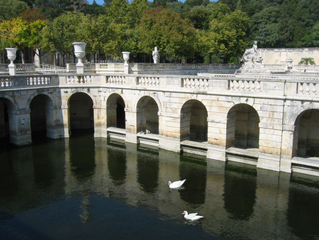Verlassen gegen halb zehn die enge Garage und finden problemlos zur Autobahn. Unterwegs beschließen wir, Montpellier links liegen zu lassen und gleich bis Nimes zu fahren. Finden an der Stadteinfahrt eine sehr neue Tiefgarage mit einem Ausgang nahe der Fußgängerzone. Schlendern ab 11:00 Uhr bei lebhaftem Wind ins Zentrum und kommen direkt zum Maison Carree. Dieser römische Tempel wird derzeit aber gerade renoviert und ist eingerüstet. In der ganz in der Nähe gelegenen Touristeninfo bekommen wir neben einem Stadtplan noch ein paar Infos zu den Hauptsehenswürdigkeiten der Stadt. So ausgestattet spazieren wir einen Kanal entlang zu einem Park mit barocker Brunnenanlage und besteigen den dahinter liegenden Hügel. Dort wartet mit dem Tour Magne der letzte Rest der einstigen römischen Befestigungsanlage auf uns. Erstehen dort das Sammelticket für die drei Attraktionen und genießen nach dem Aufstieg über eine Betonwendeltreppe den Blick über die Stadt. Wieder zu ebener Erde unten im Park machen wir Rast im Cafe neben dem römischen Diana-Tempel, der neben dem Quellheiligtum des Nemas noch erhalten blieb.
