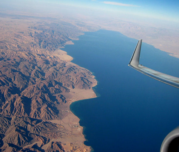 Werner hat für Fensterplätze gesorgt und so haben wir beim Start um 15:30 Uhr eine schöne Aussicht auf das hügelige Hinterland und - nach einer langen Schleife - auf den Golf von Aqaba.