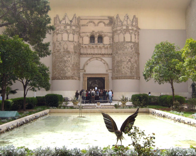 , wo wir gleich beim Öffnen um 9:00 die Besichtigung beginnen. Der Park rund um das Gebäude ist hübsch angelegt, und schon der Eingang, die Palastfassade mit Portal des Omayyadischen Wüstenschlosses Qasr al-Heir aus dem frühen 8. Jhdt., ist beeindruckend. Drinnen sind besonders die hierher verlegte Synagoge aus Dura-Europos mit ihren noch immer leuchtenden Wandmalereien, ein palmyrisches Familiengrab und diverse Fresken und Mosaike beachtenswert. Ein kleiner Schatz (von den Abmessungen) ist die fast 3.500 Jahre alte Tontafel von Ugarit, denn auf diesem nur fingerlangen Exponat findet sich in Keilschrift das älteste Alphabet der Menschheit.
