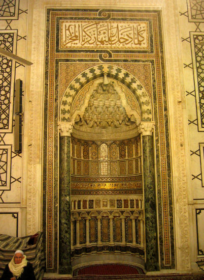 . Nachdem wir die Schuhe abgegeben haben, dürfen wir die dekorativen Goldmosaike bewundern und dann den Gebetssaal betreten. Auffällig sind die vielen korinthischen Säulen, die wohl noch aus römischer Zeit stammen, denn der Ort der ältesten Moschee Syriens war vorher bereits eine christliche Kirche und diese wiederum wurde auf den Resten eines römischen Heiligtums errichtet. Kernstück ist wie in jedem muslimischen Gotteshaus die Gebetsnische (Mihrab) und die Minbar genannte Kanzel.