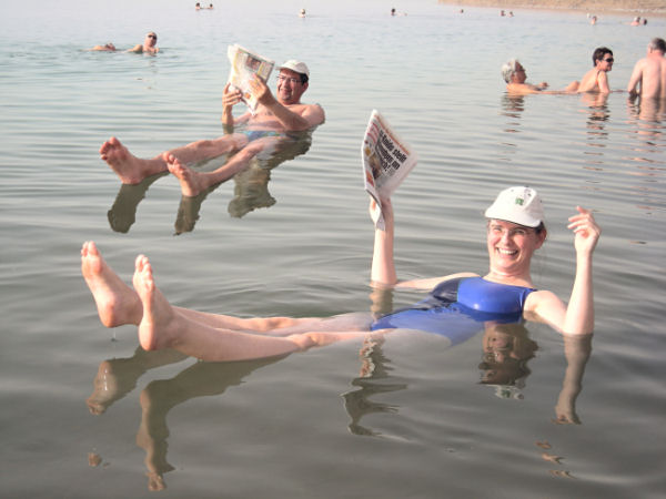 Neugierig stapfen wir über den Sandstrand hinein in das hochprozentige Salzwasser. Dann erleben wir ein unglaubliches Schwimmgefühl - man liegt auf dem Wasser wie ein Korken, Brustschwimmen unmöglich!