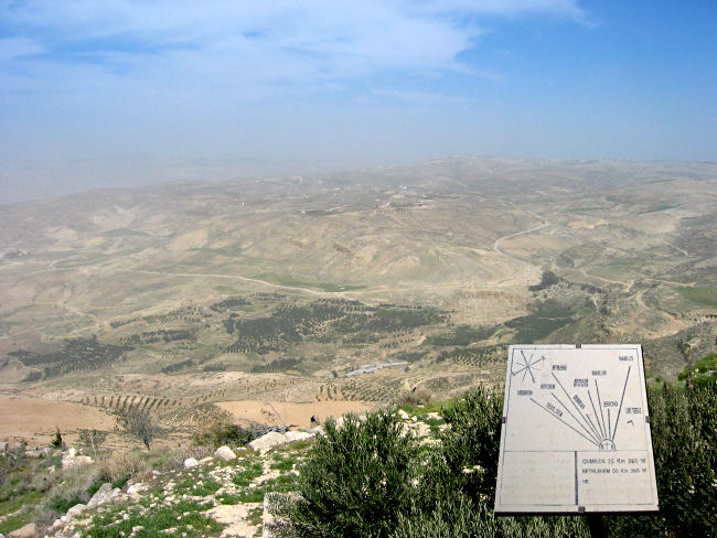 , einer Erhebung über dem Jordantal, von wo aus Moses das gelobte Land erblickt haben soll. Uns erschließt sich dieser Blick nicht, denn der feine Sand liegt wieder in der Luft und trübt die Fernsicht massiv - nicht einmal der Jordan ist zu sehen, ganz zu schweigen von Jericho, Bethlehem oder dem Toten Meer. Aber dessen ungeachtet fahren wir die Serpentinen abwärts, um nach wenigen Kurven anzuhalten und mit imaginärem Blick ins gelobte Land unser Picknick abzuhalten. Kein Baum, kein Strauch für etwas Schatten, nur Geröll, aber kein größere Stein als Sitzgelegenheit, wir zwei sind nicht sonderlich angetan von dieser Rast. Vertilgen unser Falafel-Sandwich auf den Stufen des Busses im Schatten sitzend, der Rest der Gruppe schmort brav in der Sonne.....