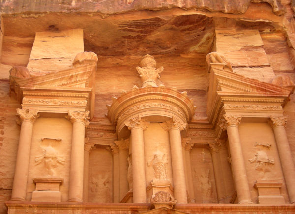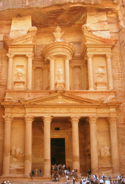ist erreicht. Alles ist aus dem roten Sandstein herausgemeißelt, exakt und wohlproportioniert - eine Wucht. Obwohl es nichts mit Ägyptern zu tun hat, hält sich der irreführende Name "Schatzhaus des Pharao" für eines der bedeutendsten Gräber der Felsenstadt hartnäckig. Das Innere ist abgesehen von der Vorhalle unter den Säulen schmucklos und nicht sehr aufregend, trotzdem wird es von Uniformierten bewacht. Fotografieren sollte man am Vormittag - nachmitags ist das Licht diffus und nicht mehr so plastisch.