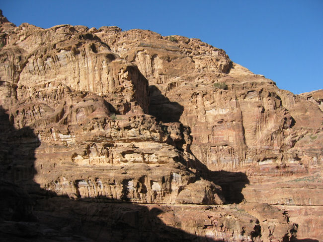 , eine Felswand mit prunkvoll gearbeiteten Grabtempeln. Wir gehen aber weiter über die einstige römische Straße durch das Zentrum der nabatäischen Hauptstadt. Hier finden sich nur wenige interessante Reste der Siedlung, am ehesten noch das Amphitheater, dafür aber massenweise Souvenirstände. Am Ende des Tales bietet neben dem römischen Tempel ein Restaurant dem Besucher Schatten und Labung, allerdings nur ein Buffet-Menü, keine Snacks oder Getränke zum Mitnehmen.