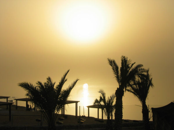 erreichen. Dichter Dunst liegt in der Luft, das Wasser geht nahtlos in den Himmel über, trotzdem ist es sehr warm und wir bemerken erst jetzt, daß wir kein Sonnenöl dabei haben. Aber Tareq beruhigt uns, hier bekommt man keinen Sonnenbrand, das geht wegen der dichten Luft 400m unter dem allgemeinem Meeresspiegelniveau gar nicht. Wir bekommen nun genügend Feizeit, um einen einmaligen Badespaß zu genießen.