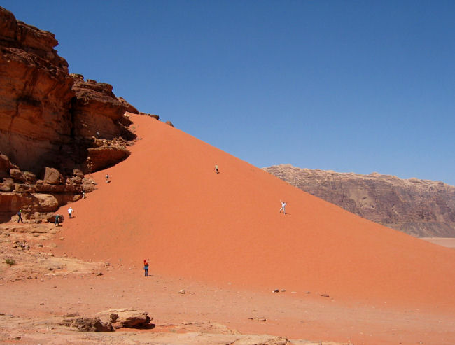 aus rotem Sand hinter einem einsam dastehenden Felsen. Da wir erst vor ein paar Monaten in Namibia mühsam ähnliche Dünen bestiegen haben, schenken wir uns dieses Abenteuer hier und schauen nur ein paar anderen aus unserer Gruppe dabei zu. Dann rumpeln wir wieder aus dem Wadi heraus und halten am Eingang zum Ort Mittagsrast.