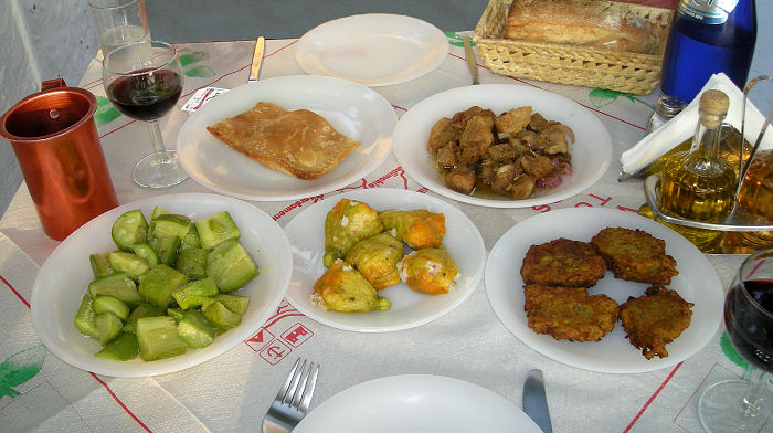 Das Abendessen unterscheidet sich nicht wirklich vom gestrigen oder dem Mittagessen, außer einer großen Schüssel Tzatziki und etwas Schafkäse findet sich nichts Landestypisches in der Auswahl.