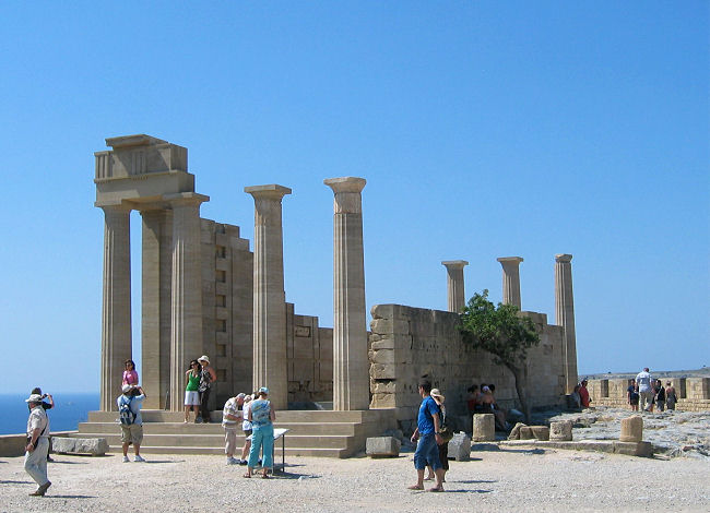 Die Gassen von Lindos quellen von gerade bus- und schiffsweise ankommenden Touristengruppen über, die alle gleichzeitig ihr Besuchsprogramm beginnen. Etwas ruhiger geht es in der orthodoxen Marienkirche zu. Diese ist außen weiß getüncht und innen vollflächig mit Wand- und Deckenmalereien ausgeschmückt - sehr beeindruckend. Spazieren durch die von Restaurants und Souvenirshops gesäumten engen Gassen aufwärts und kommen so zur Akropolis. Auf dem Hügel über der Stadt stehen die Reste einer Mischung aus griechischem Tempel und Kreuzritterburg. Hier wird intensiv an der Restaurierung gearbeitet, manche Teile der Anlage sind regelrechte Baustellen und die Kräne stören etwas das Bild. Aber der Blick auf das Meer und den weißen Ort ohne störende Neubauten ist sehr malerisch.