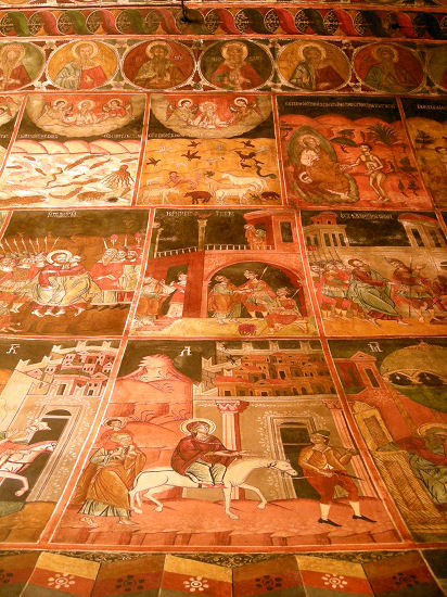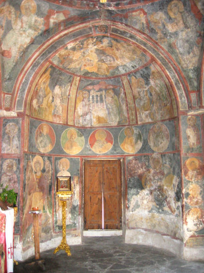 Über abenteuerliche Serpentinen geht es zum Kirchlein Agios Nikólaos Fountoúkli. Der kleine Kuppelbau strahlt im warmen Licht der Nachmittagssonne, und auch das über und über mit Fresken geschmückte Innere ist sehenswert. So wie es aussieht, sind sie seit ihrer Entstehung im 15. Jhdt. nie renoviert oder konserviert worden.