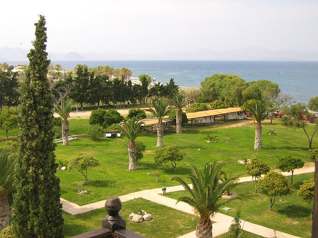 Fahren mit dem PKW nach Zürich und nehmen dort die Dienste des "Airportparking-Service" in Anspruch. Können direkt am Abflugterminal aussteigen und lassen unser Auto wegbringen. Checken die Rucksäcke ein und warten auf den Abflug, der kurz nach 10:00 Uhr erfolgt. Nach ca. dreistündigem Flug landen wir mit einer Stunde Zeitverschiebung bei leicht bedecktem Himmel auf der viertgrößten griechischen Insel. Unser Autovermieter hat sein Büro am anderen Ende des Flughafen-Parkplatzes und dort bekommen wir einen putzigkleinen Chevrolet Matiz mit Faltdach. Unser Gepäck hat gerade Platz im Kofferraum und schon bald folgen wir den nur bedingt leserlichen Schildern vom Airport nach Kos-Stadt. Finden erstaunlich problemlos zum ca. 7 km westlich gelegenen Hotel "Oceanis Beach Resort" in Psalidi und bekommen ein Zimmer im dritten Stock mit seitlichem Meerblick vom Balkon aus.
