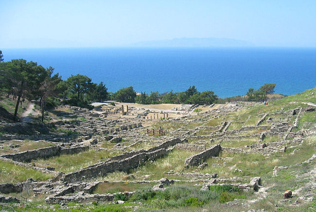 Der nächste planmäßige Stopp ist in Kámiros, dort sind die Ruinen des kleinsten der drei antiken Stadtstaaten der Insel zu besichtigen. Stapfen gegen 15:30 los und bestaunen Mauerreste und Tempelfragmente. Steigen hügelan und können von dort oben wieder über das weite Meer blicken.