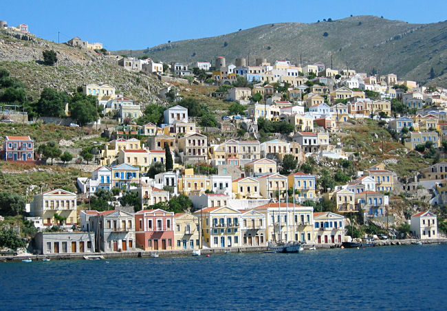 Folgen der Ostküste der Insel und kommen an unserem Hotel und den Thermen vorbei, die allerdings im Morgendunst verschwimmen. Circa 15 Minuten nach dem Ablegen gibt es nichts mehr zu sehen und der Fahrtwind pfeift uns um die Ohren. Verbringen eine knappe Stunde in der Passagierkabine, dann gibt es den planmäßigen Zwischenstopp auf Symi, den wir wieder an Deck verbringen. Die Hafeneinfahrt ist eng und der Ort mit den gelbweißen Häuschen ist malerisch an die kargen Hügel rund um die Bucht gepappt. Die letzte Etappe verläuft ebenso ruhig wie der erste Teil, und um 10:00 Uhr sind die alten Windmühlen und das kleine Fort an der Hafeneinfahrt von Rhodos zu sehen. Die Fähren legen nicht im Mandráki-Hafen an, sondern im neuen Hafen südlich davon.