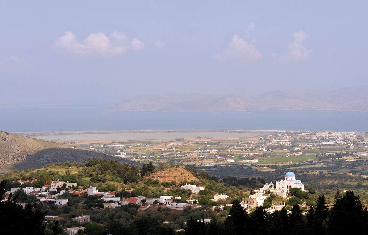 Nach etwas mehr als einer Stunde Staunen und Wundern verlassen wir das Altertum und kommen über den Insel-Highway und eine kleine Bergstraße ins sehr touristische Bergdorf Zia. Quetschen unser kleines Auto in eine halboffizielle Parklücke, dann schlendern wir durch die mit Souvenirs vollgestopften Gäßchen und steigen dabei immer weiter aufwärts. Von hier oben wäre der Blick über die Insel und das Meer bis in die Türkei bei besserem Wetter bestimmt hübsch, aber heute verschwindet die Landschaft in Dunst und Wolken.