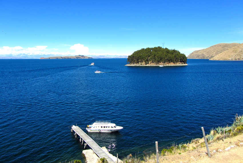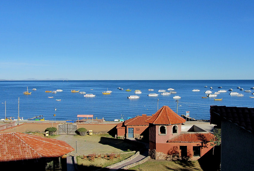 Erleben vom verglasten Badezimmer aus eine wunderschöne Morgenstimmung am Titicacasee. Auch beim guten Buffet-Frühstück genießen wir den Blick auf den See und verfolgen das Erwachen des kleinen Dorfes. Pünktlich um halb neun holt uns David zum heutigen Besichtigungsprogramm ab. Wir spazieren zum Hafen, wo bereits ein Ausflugsboot auf uns wartet. Sind (wie vereinbart) die einzigen Passagiere und tuckern in gut zwei Stunden zur Isla de la Luna.