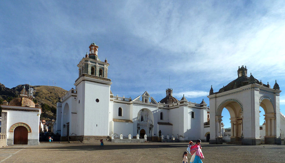 Nun folgt die 90-minütige Rückfahrt über den noch immer sanft gewellten See nach Copacabana. Nach dem Anlegen holen wir im Hotel die dort deponierten Rucksäcke und werden von Omar mit dem Wagen abgeholt. Wir fahren auf den Hügel über der Stadt, wo die Basílica de la Virgen de la Candelaria auf Pilger und Besucher wartet. Die braune Madonnenstatue (Virgen Morena), von einem Inka-Künstler im 16. Jahrhundert geschnitzt, gilt weit über die bolivianischen Grenzen hinaus als wundertätig.
