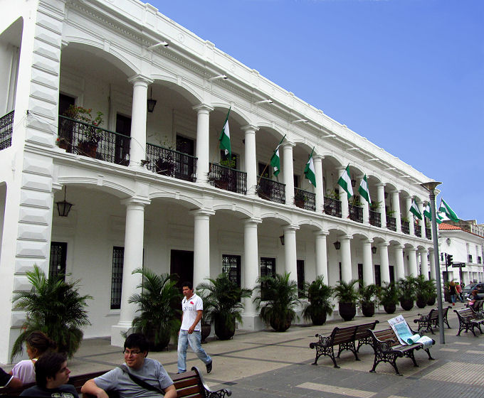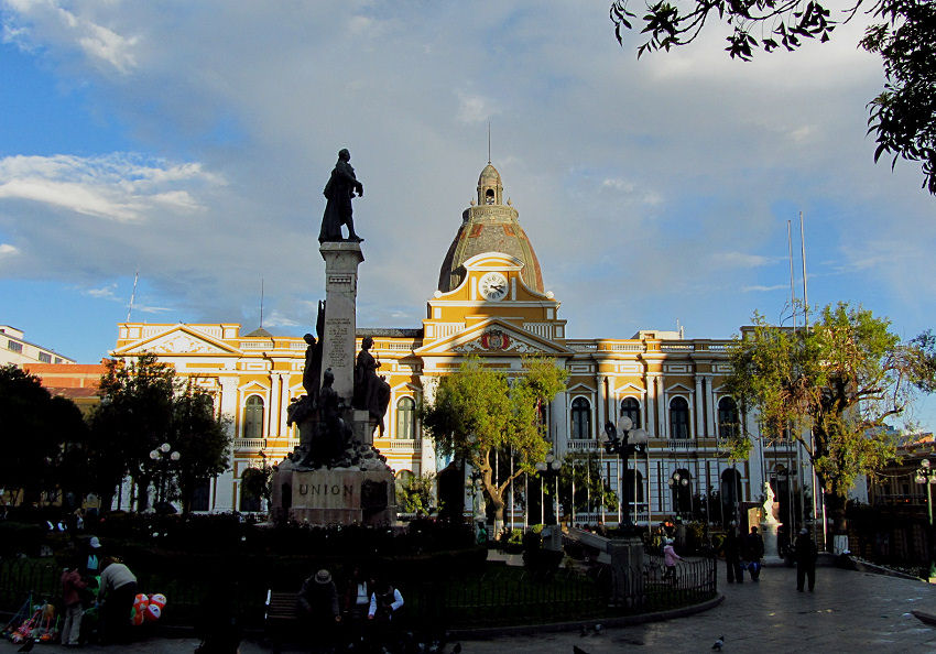Kinder ausgeführt und Erinnerungsfotos geschossen. Wir Touristen interessieren uns aber mehr für das Murillo-Denkmal in der Mitte, sowie das Parlament auf der einen Seite, die Kathedrale und der Regierungspalast mit pittoresker Palastwache auf der anderen Seite des Platzes.