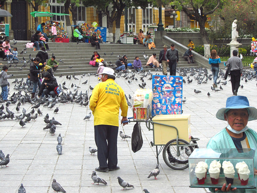 Am Nachmittag verlassen wir das Hotel in die andere Richtung, denn auch die zentrale Plaza Murillo ist nur wenige Häuserblocks entfernt. Auf diesem Platz spielt sich am Sonntag das Leben der Einheimischen ab. Hier werden Tauben gefüttert, Geleespeisen und Luftballons verkauft,