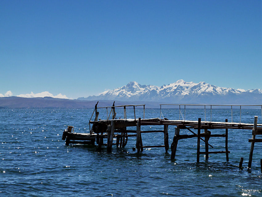 Der kürzeste Weg zu unserem heutigen Übernachtungsort Copacabana führt die Straße weiter und über peruanisches Gebiet, aber so einfach geht das nicht. Wir müssen wieder eine Stunde zurück bis El Alto, dort zweigen wir ab und dann geht es auf einer anderen Hauptstraße westwärts. Folgen eine kleine Weile den Ufern des Titicaca-Sees, der uns mit den verschiedensten Blau- und Türkis-Tönen begeistert, dann erreichen wir an der schmalsten Stelle des Sees den Fährhafen San Pedro. Dort wechseln wir auf eine kleine Personenfähre, während unser Minibus auf eine wackelige Holzautofähre rollt. Wir legen später ab, sind aber früher am circa 800 m entfernten Ufer der Halbinsel.
