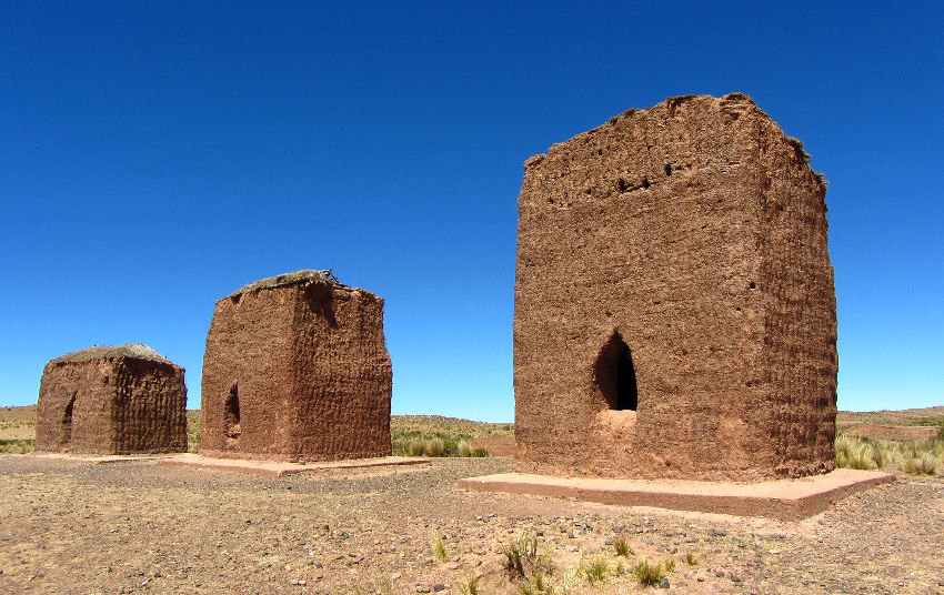 Unterwegs machen wir Halt bei Chullpas, präkolumbischen Grabtürmen aus dem 12. und 13. Jahrhundert. In diesen bis zu 10 Meter hohen (hier in Bolivien aus Lehm gefertigten) Türmen wurden bedeutende Persönlichkeiten und Familien beigesetzt. Leider sind die meisten Grabtürme durch Grabräuber geplündert worden.