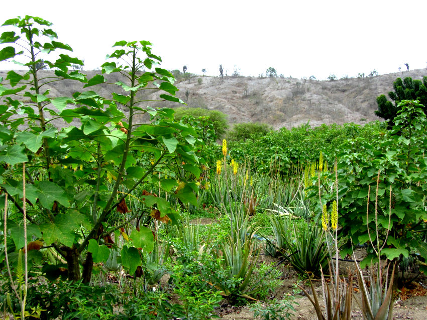 Die Garúa legt sich zäh auf die trockene Landschaft, der Staub verklebt zu einem klumpigen Belag. Bertram zeigt uns zuerst die gleich beim Pfarrhaus gelegenen Opuntien- und Aloe Vera-Felder, die derzeit wenig Pflege brauchen, dann fahren wir zur eigentlichen Finca. Dort wird alles Mögliche an Obst und Gemüse, sowohl für den Eigenbedarf als auch für den Verkauf angebaut.