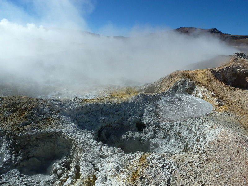 Weiter geht die Fahrt durch eine karge Mondlandschaft mit vielen schönen Vulkanen am Horizont. Gegen halb acht erreichen wir die Laguna Colorada, in deutschen Büchern Rote Lagune genannt. Ist nicht spektakulär rot, aber Flamingos und die Vulkane spiegeln sich im dunklen Wasser und Alpakas stehen im Morgennebel. Der nächste Programmpunkt nach dem Besucherzentrum ist das Geysirfeld "Sol de Mañana". Fahren über eine holprige Piste immer weiter aufwärts, bis wir eine Höhe von 5000 Metern erreichen. Die Luft ist erfüllt vom einem Fauchen und Brummen, dessen Ursprung wir nicht finden. Dann macht unser Führer mit einem Stein das Phänomen für uns sichtbar --> heiße Luft, die mit großem Druck aus einem Loch im Boden schießt und erst am Stein Dampf bildet.
