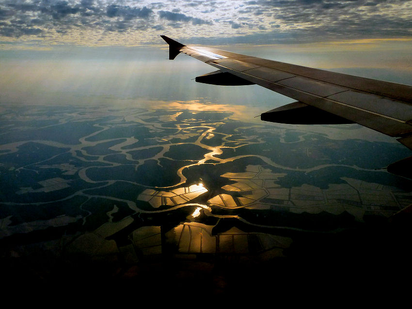 Abfahrt um 13:45 und zügige Fahrt bis zur Stadtgrenze von Guayaquil. Dann beginnt es zu stauen und wir kommen langsam ins Schwitzen: die Boardingzeit rückt näher und wir sind noch weit weg vom Flughafen! Endlich kommen wir beim Busterminal an und hasten zu den Taxiplätzen, um uns zum Airport bringen zu lassen. Stehen damit im gleichen Stau wie zuvor. Kommen eine Stunde später als beabsichtigt zum Check-in, Glück gehabt, dass wir schon Boardingpässe haben. Nun müssen wir nur noch die langwierigen Ausreiseformalitäten mit Passkontrolle und Sicherheitscheck hinter uns bringen, dann noch der Ganzkörper-Scan, und um 17:55 sind wir endlich am Gate. Beim Einsteigen in die Maschine der KLM sind schon einige Plätze belegt, denn der Flieger kommt aus Quito. Abflug gegen 19:00 Uhr und unterwegs mittelprächtige Verpflegung, kein Vergleich mit dem Herflug. Dösen vor uns hin...
