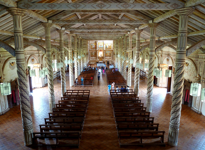 Dann spazieren wir ins Zentrum zur Anfang des 18. Jahrhunderts vom Schweizer Jesuiten-Missionar Martin Schmid erbauten Missionskirche. Die ganze Anlage ist hell getüncht und mit Ornamenten in Erdfarben geschmückt. Besonders die gedrechselten Säulen aus Tropenholz, die das Dach tragen, sind beeindruckend. Auch das Innere ist hell und gänzlich aus Holz errichtet, ebenso wie die Kreuzgang-Konstruktion. Ab 1970 hat der Schweizer Architekt Hans Roth hier, wie in anderen Missionen Tausende Arbeitsstunden mit freiwilligen Helfern investiert, um dieses fantastische Bauwerk wieder in dem Glanz erscheinen zu lassen, den es einst ausstrahlte. 1990 ernannte die UNESCO San Javier zusammen mit 5 anderen Missionen in Bolivien zum Weltkulturerbe.