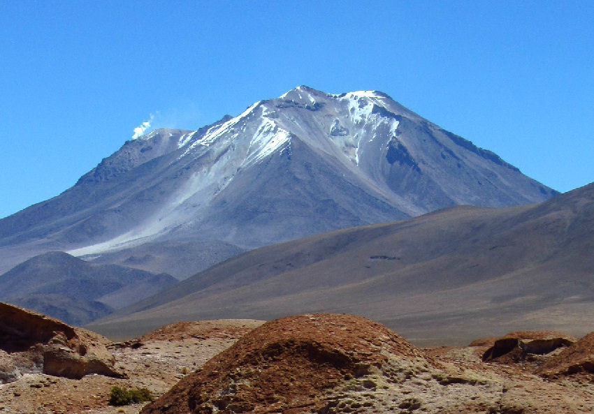 Weiter geht die Fahrt zu einem Aussichtspunkt mit unzähligen Tour-Jeeps und Touristen, die den Ausblick auf den noch immer aktiven Vulkan Ollagüe mit einer kleinen Rauchsäule an der Westflanke bewundern. Nachdem auch wir dieses Schauspiel und die beeindruckende Landschaft gebührend bestaunt haben, rumpeln wir weiter. Plötzlich biegt Placido auf eine nicht mehr wirklich erkennbare felsige Piste ab und wir werden auf der weiteren Fahrt hinauf in die Berge ganz schön durchgebeutelt.