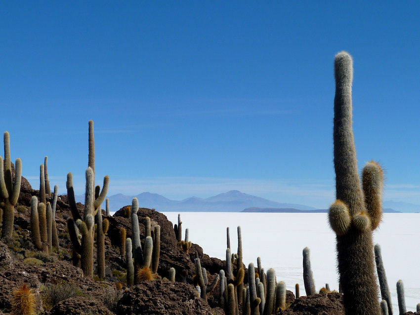 Nun rauschen wir etwa 60 km über die blendend weiße Salzkruste zur Isla Inkahuasi (Haus der Inka, auch Fischinsel genannt) wo wir gegen halb zwei eintreffen. Sie ist auch schon von Touristengruppen belagert und hier vertilgen wir erst einmal das inkludierte Mittagessen im kleinen Restaurant. Dann werden wir zum Besuch des Panoramawegs entlang der riesigen Kakteen entlassen. Die mehrere Meter hohen und mehrere hundert Jahre alten Säulenkakteen (9 m = 900 Jahre) vor dem gleichförmigen weißen Hintergrund sind wirklich beeindruckend. Es gibt sie zu Hunderten in allen möglichen Formen und Ausprägungen. Erstaunlich für unsere Verhältnisse ist, dass uns so viel Natur, so faszinieren und begeistern kann!