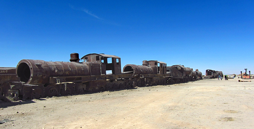 Etwas später als vereinbart holt uns Placido ab und wir fahren erst einmal zum Zugfriedhof am Rande der Stadt. Hier rosten ausrangierte Dampflokomotiven und Waggons malerisch vor sich hin. Einst waren sie für den Transport von Mineralien aus den Bergwerken um Potosí und La Paz nach Antofagasta im heutigen Chile eingesetzt, nun sind sie eine Touristenattraktion.