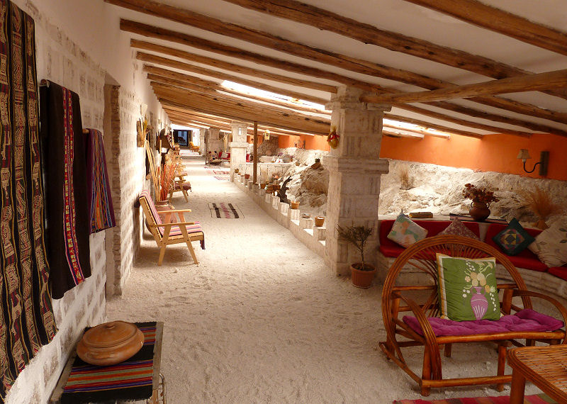 Von hier geht es über eine schmale Erdpiste zum Salzhotel Tayka Tahua. Es ist wie sein Vorbild (das erste Salzhotel) komplett aus Salzziegeln errichtet und gemütlich eingerichtet. Da wir mit Placido eine Sonnenuntergangs-Fahrt vereinbart haben, halten wir uns vorerst nicht lange auf und brettern kurz nach 18:00 Uhr schon wieder über den Salzsee.