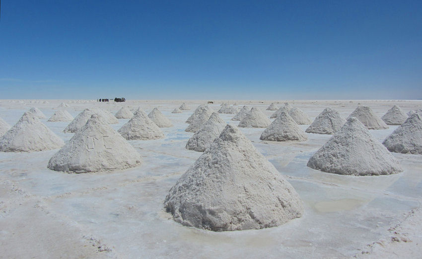 Anschließend rumpeln wir - wie viele andere Touristen-Jeeps auch - nach Colchani, dem Tor zum Salzsee. In diesem Ort warten zuerst einmal ein Souvenirmarkt mit Strickwaren, Andensouvenirs und Salzschnitzereien und am Ortsrand endlich das Ufer des Salar de Uyuni. Hier wird nach alter Tradition das Salz noch von Hand gewonnen, die "Ernte" wird zum Trocknen in pyramidenartigen Gebilden aufgeschichtet und hier trifft sich dann die ganze Jeep-Flotte wieder.